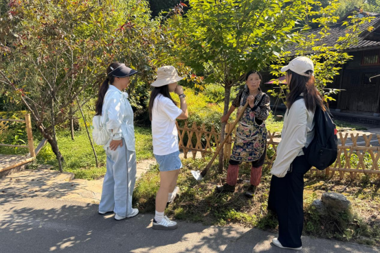 抵达桃花源记景区后,实践团深入了解了桃花源记景区的发展历程。该景区以陶渊明《桃花源记》为蓝本,结合当地喀斯特地貌、田园山水风光及仡佬族苗族文化打造,于2018年被评为国家4A级旅游景区。景区乡村气息浓厚,包含桃花湖、桃花洞等自然景观,其特色民宿吸引川渝湘多地游客前来康养、旅居。