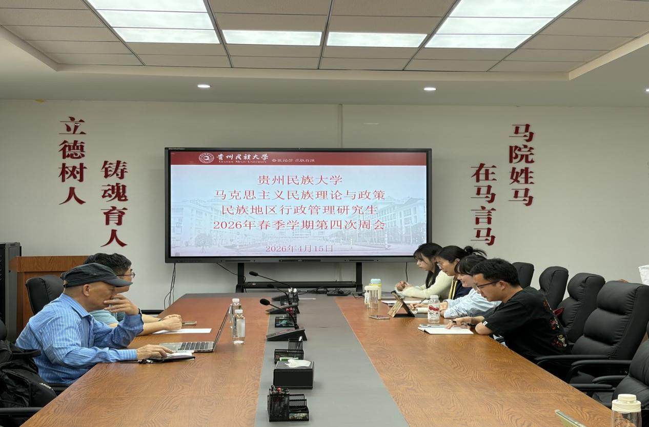 马克思主义民族理论与政策研究生2026年春季学期第四次周会在马克思主义学院529会议室召开。此次会议主要围绕“研一同学代表作寒假期间学习与调研情况汇报”展开,由25级研究生王洪玉、胡佳莹、胡超3位研一同学代表作汇报。杨昌儒教授、冯志伟副教授出席本次会议,其余研究生旁听会议。