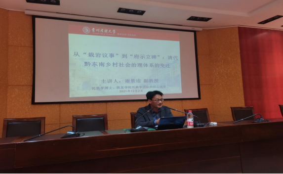 谢博士在此次讲座中分别从五个内容展开:一、明代经营贵州:贵州战略地位突显;二、化外之地:不隶版图,不奉约束;三、栽岩议事:自立自主的管理体系;四、黔东南乡村社会的“内地化”过程;五、府示立碑:国家治理体系的地方呈现等。他认为在“府示立碑”推行国家治理体系的过程中,不仅是在推进朝廷的礼与俗,亦是“文字进疆”的过程。